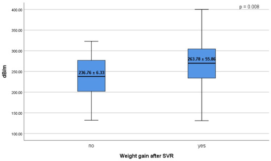 We performed a univariate linear regression analysis to identify the risk factors associated with a CAP increase at SVR12, after which only those with a significant p value were included in the multivariate regression analysis (Table 3). In a univariate regression model, fasting plasma glucose, increased cholesterol and triglycerides levels, and a higher BMI were significantly associated with an increase in CAP values between the baseline and 12 weeks after completion of DAAs therapy. Multivariate linear regression analysis showed that BMI (β = 0.328, p < 0.001) and triglycerides (β = 0.148, p = 0.017) were independent risk factors associated with the CAP score in all patients. Furthermore, we noticed that patients with significant weight gain at SVR12 had higher CAP values than patients without weight gain (CAP = 263.78 ± 55.86 dB/m, p = 0.008 vs. CAP = 236.76 ± 6.33) (Figure 4).