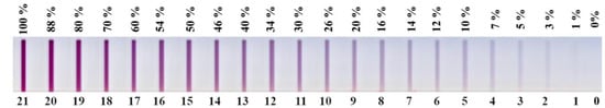 Color intensity scale of the STANDARD Q COVID-19 Ag test (Q Ag) (SD Biosensor, Suwon, Korea). The color intensities that appeared on the test kits were compared with the color scale and were recorded within the range of 0 to 21 as negative to very strong, respectively.