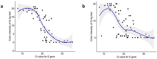 Spearman’s correlation analysis of the color intensity of the rapid antigen test (0: negative; 1: very weak; 21: very strong) and Ct values for the E determined by real-time PCR. (a) nasopharyngeal swab specimens (rho = −0.876, p < 0.01), (b) nasal cavity swab specimens (rho = −0.725, p < 0.01).