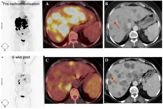 - Zerizer, I.; Al-Nahhas, A.; Towey, D.; Tait, P.; Ariff, B.; Wasan, H.; Hatice, G.; Habib, N.; Barwick, T. The role of early ¹⁸F-FDG PET/CT in prediction of progression-free survival after ⁹⁰Y radioembolization: Comparison with RECIST and tumour density criteria. Eur. J. Nucl. Med. Mol. Imaging 2012, 39, 1391–1399. [Google Scholar] [CrossRef]