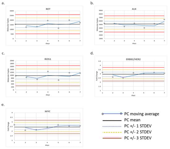 Control charts for CNA and fusion/skipping variant types. (a) CCDC6-RET fusion, (b) EML4-ALK fusion, (c) CD74-ROS1 fusion, (d) ERBB2/HER2 amplification, and (e) MYC amplification detected within the positive control over seven days of testing.
