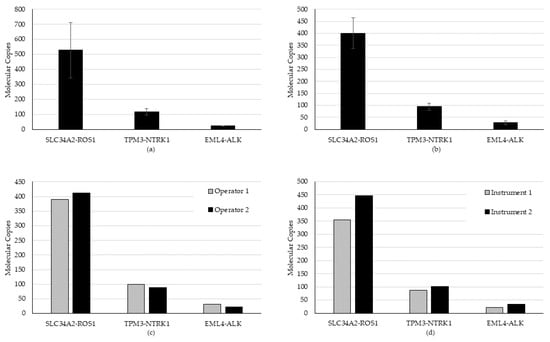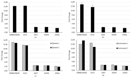 Repeatability and intermediate precision study results for the CNA variant type. (a) Repeatability, (b) inter-day, (c) inter-operator, and (d) inter-instrument variability were evaluated using two contrived specimens representing five unique amplification events. Overall, the study demonstrated acceptable consistency in the detection of both the CNA and fusion/exon-skipping variant types in biologically relevant specimens.