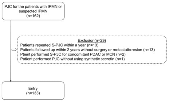The algorithm used for patients’ inclusion and exclusion in this study. A total of 162 patients with IPMN or suspected IPMN were included. After excluding 29 patients (due to repeated S-PJC within a year, follow-up within 2 years without surgery or metastatic lesion, concomitant pancreatic ductal adenocarcinoma or mucinous cyst neoplasm, and the use of PJC without synthetic secretin), the remaining 133 patients were enrolled in this study. S-PJC: secretin-loaded pancreatic juice cytology; PJC: pancreatic juice cytology; PDAC: pancreatic ductal adenocarcinoma; MCN: mucinous cystic neoplasm; IPMN: intraductal papillary mucinous neoplasia.