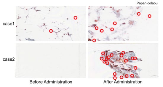 Comparison of cell numbers in the pancreatic juice before and after synthetic secretin administration. After synthetic secretin administration, cell clumps (red circles) were increased in both cases 1 and 2.