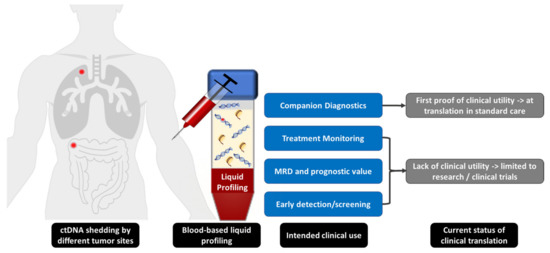 The concept of liquid biopsy emerged almost a decade ago as an attractive alternative and represents one of the most active research areas in oncology [1]. Although liquid biopsy comprises analysis of circulating tumor DNA (ctDNA), circulating tumor cells (CTC), exosomes, and tumor-derived platelets, among others, most commonly used in precision medicine is ctDNA because it promises to negate the limitations of tissue-based genetic testing. ctDNA analysis can precisely be described by the term liquid profiling (LP) as it relies on the detection of tumor-associated genetic or epigenetic alterations in different body fluids of tumor patients. It allows researchers to assess the cumulative genetic tumor profile longitudinally in a minimally invasive manner, in real-time, from a single blood draw, as the most frequently used sample material [10]. Thus, LP mirrors intra- and intertumoral heterogeneity and, if performed over time, facilitates the detection of acquired drug-resistance mechanisms [11,12,13]. However, little is known about the origin and biological function of ctDNA, and it often represents only a minute fraction of total cell free DNA (cfDNA), which predominantly originates from hematopoietic cells [14]. The fraction of ctDNA of total cfDNA varies from 0.01% to more than 60%, depending on tumor stage, tumor type, and tumor burden, as well as treatment regime and timing of sampling [15,16,17]. Moreover, physiological and pathophysiological conditions associated with increased turnover of normal tissue or blood cells (e.g., exercise, inflammation, trauma, obesity) may alter ctDNA fraction. In addition to the low abundance, the short half-life of 15 min to 2.5 h with clearance by kidney, liver, and nuclease activity compromises diagnostic testing, as does the highly fragmented nature [12]. The mean fragment size of cfDNA of 167 bp and multiples thereof corresponds to nucleosomes [18] and suggests the predominant origin from apoptotic cells besides necrosis and active secretion [19,20]. Noticeably, it has been shown that ctDNA is 20 base pairs shorter than cfDNA from healthy cells that might be explained by differences in the nucleosomal patterning between malignant and hematopoietic cells and DNase activity [18,21].