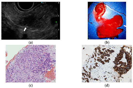 - Oka, K.; Inoue, K.; Sugino, S.; Harada, T.; Tsuji, T.; Nakashima, S.; Katayama, T.; Okuda, T.; Kin, S.; Nagata, A.; et al. Anaplastic carcinoma of the pancreas diagnosed by endoscopic ultrasound-guided fine-needle aspiration: A case report and review of the literature. J. Med. Case Rep. 2018, 12, 152. [Google Scholar] [CrossRef] [Green Version]
