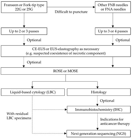 - Bang, J.Y.; Magee, S.H.; Ramesh, J.; Trevino, J.M.; Varadarajulu, S. Randomized trial comparing fanning with standard technique for endoscopic ultrasound-guided fine-needle aspiration of solid pancreatic mass lesions. Endoscopy 2013, 45, 445–450. [Google Scholar] [CrossRef] [Green Version]
