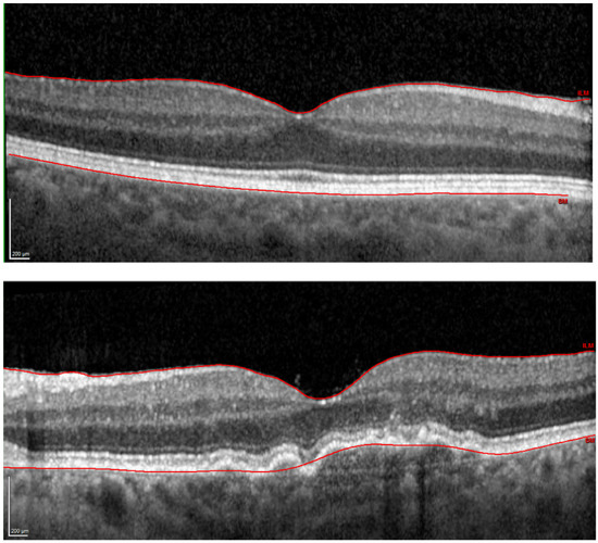 Optical coherence tomography images of a representative control (upper panel) and disease (lower panel) case. The solid red line indicates the automatic retinal layer segmentation, which defines the retinal thickness.