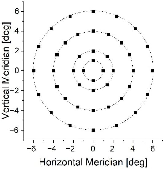 IR light sensitivity was assessed using a customized optical system. A detailed description of the setup can be found elsewhere [4,7,8]. In brief, a femtosecond laser (HighQ-2, Spectra-Physics, Milpitas, CA, USA) and a set of galvo scanners controlled by customized software direct ultrashort pulses of 1045-nm light at the retina. Note that the laser power was well below safety limits stipulated by ANSI Z136.1-2014 and EN 60825-1:2014 requirements due to a controlled light loss in the optical path and a set of neutral-density filters. A trajectory of each projection was predefined and executed to consecutively draw a circular (not-filled) pattern in each position. Measurement settings were adjusted to mimic MP1 conditions in terms of the stimulus size and presentation time, as well as the background luminance. A monochromatic (630 nm) light-emitting diode with a diameter of 0.1° served as a fixation target. Although the same grid point was applied for IR light testing (Figure 2), a standard staircase procedure with the stimulus intensity increasing monotonously until it became noticeable replaced the 4-2-1 strategy [18]. Two measurements per retinal loci were taken in a randomized order. The subject used a computer mouse button to indicate the presence of the stimulus. IR light sensitivity examination time (approx. 13 min) in healthy subjects was longer than with the MP1 device (approx. 7 min). Although our setup does not feature eye tracking, careful monitoring of patient gaze stability was performed in real-time using fundus imaging, produced by a scanning laser ophthalmoscope (SLO) system operating at 880 nm, and a pupil preview camera with a 950-nm illumination ring.