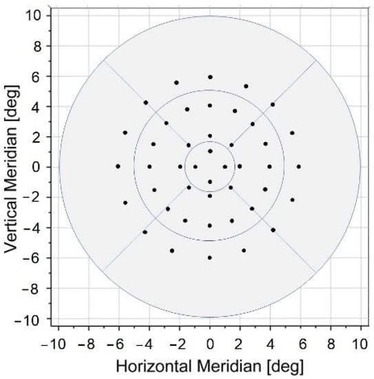 Non-parametric methods were applied with descriptive statistics given as a median (interquartile range; IQR) due to the skewness of MP1 retinal sensitivity results. Mann–Whitney U test was performed to assess the significance of (pooled) sensitivity differences between the disease and control groups as well as age. A p-value of less than 0.05 was set to indicate a statistically significant difference. Left eye visual field results were right eye transposed. A pointwise comparison of microperimetry data was performed with triangular interpolation to simulate an XYZ visual field representation. In addition, a radial stratification of points having the same angular range (Figure 2) was applied, which resulted in the formation of four subgroups with a radius from the fovea of 1°, 2°, 4°, and 6°. Finally, Spearman’s rank correlation coefficient (denoted as ρ) was used to test the usefulness of the central subfield thickness in predicting retinal sensitivity changes. To this end, we selected 4 loci occupying the center of the test grid (Figure 3) and calculated their mean sensitivity. The resulting values were then correlated with the retinal thickness deviation from a normal (287.5 µm) level found in the current study. We used OriginPro 2020 (OriginLab, Corporation, Northampton, MA, USA) for data analysis and visualization.