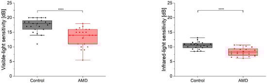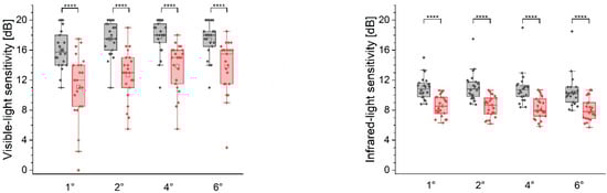 Two-group comparison for visible (left panel) and infrared light (right panel) sensitivity assessment. The box width indicates the interquartile range. The whiskers denote the fifth and 95th percentiles; the open squares refer to the mean value; and solid lines indicate the median level; points are individual data. **** p < 0.001.