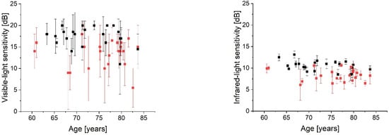 The median sensitivity to IR light was 8.3 (7.2, 9.3) dB in the AMD cases and 10.7 (9.7, 11.2) dB in the normal population. The MP1 assessment showed 14.0 (11.0; 15.5) dB for disease and 18.0 (16.3; 18.9) dB for control subjects. Both comparisons (Figure 4) yielded statistically significant differences (p < 0.001). Figure 5 shows the age distribution of the (pooled) retinal sensitivity. The correlation coefficient (ρ) found in the control group was −0.35 for IR- and −0.11 for visible-light; however, it did not reach significance level (p > 0.05) for both approaches. An increased intrasubject variability (manifested by a higher IQR) can be observed in the MP1 results of both cohorts (Figure 5).