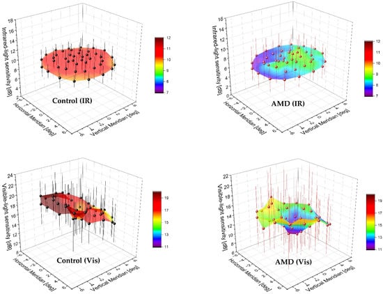 The presence of AMD upsets this uniform distribution, showing a sensitivity peak shift and a valley starting near 1° and extending temporally to 6°. The MP1 measurements of the normal and AMD eyes yielded a depression in the center of the testing area. A tilt of the surface map indicated nonuniformity of retinal sensitivity results, which was less pronounced in AMD. Although the IQR recorded in the AMD cases was comparable between the two methods, the visible-light microperimetry appeared to exhibit higher intersubject variability in the control group.