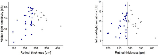 The AMD eyes’ central subfield thickness was 272.0 (252.5; 288) µm, which was lower than that found in the controls: 287.5 (280; 312.0) µm. The median value of the control group provided a reference for the macular thickness vs. sensitivity plot (Figure 8) to create two subgroups for statistical analysis. Retinal thinning showed a significant correlation with the loss of retinal sensitivity detected with visible (ρ = 0.43, p = 0.02) and IR light (ρ = 0.48, p = 0.01). However, the increase of the central subfield thickness demonstrated a lower correlation (ρvis = 0.26 and ρIR = 0.31), which did not reach the significance level.