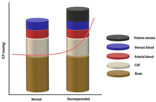 Under normal conditions, the intracranial volume is constant, and maintaining a steady ICP depends on the volume of the intracranial compartments (brain + CSF + blood): an increase in one component will cause a compensatory decrease in one or both of the others [,]. Raised ICP can result from any pathological condition increasing the volume of any of the three components or from the addition of a fourth component (e.g., intracranial hemorrhage, cerebral edema, or mass), overwhelming the compensatory mechanisms. Once the reserve is exhausted, the intracranial compliance will decrease, and slight elevations in the intracranial volume will lead to dramatic changes in ICP [,]. CO2, O2 and blood vessels size influence ICP in the critically ill patient [,].