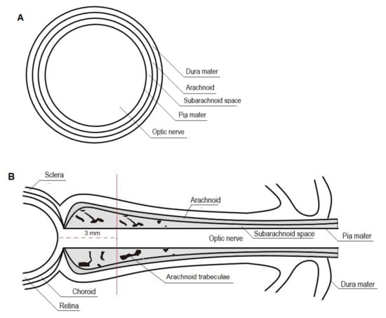 - Hansen, H.C.; Helmke, K. The subarachnoid space surrounding the optic nerves. An ultrasound study of the optic nerve sheath. Surg. Radiol. Anat. 1996, 18, 323–328. [Google Scholar] [CrossRef]