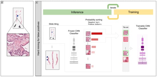 The training method that we used in this study was exactly the same as reported in a previous study []. For completeness, we repeat the method here. To apply the CNN on the WSIs, we performed slide tiling by extracting square tiles from tissue regions. On a given WSI, we detected the tissue regions and eliminated most of the white background by performing a thresholding on a grayscale version of the WSI using Otsu’s method []. During prediction, we performed the tiling in a sliding window fashion, using a fixed-size stride, to obtain predictions for all the tissue regions. During training, we initially performed random balanced sampling of tiles from the tissue regions, where we tried to maintain an equal balance of each label in the training batch. To do so, we placed the WSIs in a shuffled queue such that we looped over the labels in succession (i.e., we alternated between picking a WSI with a positive label and a negative label). Once a WSI was selected, we randomly sampled tiles from each WSI to form a balanced batch. To maintain the balance on the WSI, we oversampled from the WSIs to ensure the model trained on tiles from all of the WSIs in each epoch. We then switched to the hard mining of tiles once there was no longer any improvement on the validation set after two epochs. To perform the hard mining, we alternated between training and inference. During inference, the CNN was applied in a sliding window fashion on all of the tissue regions in the WSI, and we then selected the k tiles with the highest probability for being positive if the WSI was negative and the k tiles with the lowest probability for being positive if the WSI was positive. This step effectively selected the hard examples with which the model was struggling. The selected tiles were placed in a training subset, and once that subset contained N tiles, the training was run. We used , , and a batch size of 32.