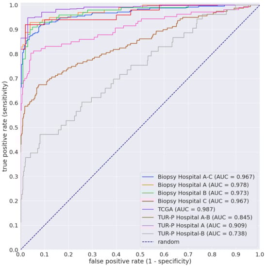 The best model (TL-colon poorly ADC-2 (20×, 512)) achieved similar values of the ROC-AUC, log loss, accuracy, sensitivity, and specificity among three independent medical institutes (Hospitals A, B, C) and the TCGA public dataset test sets (Table 4 and Table 5), meaning that the best model has general versatility in prostate needle biopsy WSIs.