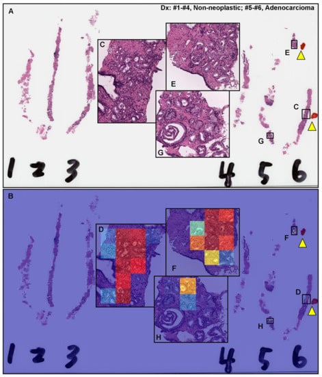 Our model (TL-colon poorly ADC-2 (20×, 512)) satisfactorily predicted prostate adenocarcinoma on needle biopsy specimens (Figure 3A). According to the pathological diagnostic report, there were adenocarcinoma foci in two of six needle biopsy cores (#5 and #6), which the pathologists marked as red ink dots (yellow triangles) on the glass slides. The heat map image shows true positive predictions (Figure 3B,D,F,H) of adenocarcinoma cell infiltrating areas (Figure 3C,E,G). In Figure 3G, the pathologists did not mark when they performed the diagnosis; however, the heat map image show true positive predictions of adenocarcinoma foci, which were reviewed and verified as adenocarcinoma by other pathologists (Figure 3H). In contrast, the heat map image does not show true positive predictions on glomeruloid glands precisely, which were assigned a Gleason Pattern 4 [,] (Figure 3G,H). Importantly, the heat map images also exhibit a perfect true negative prediction of needle biopsy cores (#1–#4) on the same WSI (Figure 3B).