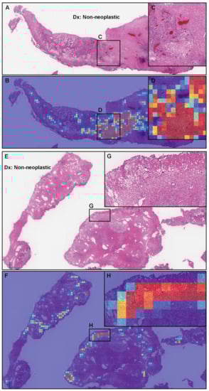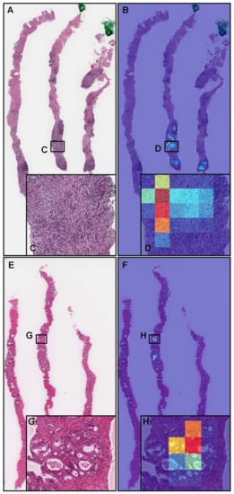 Inflammatory tissues (Figure 4A) and prostatic hyperplasia (Figure 4E) were false positively predicted for prostate adenocarcinoma (Figure 4B,F) using the transfer learning model (TL-colon poorly ADC-2 (20×, 512)). In the inflammatory tissue (Figure 4A), the infiltration of chronic inflammatory cells including histiocytes, lymphocytes, and plasma cells (Figure 4C) was the primary cause of the false positive prediction (Figure 4D) due to a morphology analogous to adenocarcinoma cells. Prostatic hyperplasia (Figure 4E) with irregularly shaped and diverse sizes of tubular structures (Figure 4G) was the primary cause of the false positive prediction (Figure 4H).