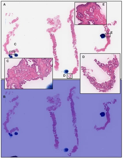- Epstein, J.I.; Egevad, L.; Amin, M.B.; Delahunt, B.; Srigley, J.R.; Humphrey, P.A. The 2014 International Society of Urological Pathology (ISUP) consensus conference on Gleason grading of prostatic carcinoma. Am. J. Surg. Pathol. 2016, 40, 244–252. [Google Scholar] [CrossRef] [PubMed]