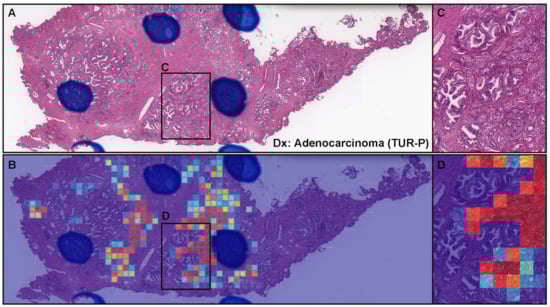 Although not as accurate as the biopsy specimens (Table 4), there were many cases in which prostate adenocarcinoma could be classified precisely on the TUR-P specimens. In a representative true positive TUR-P case (Figure 6A), the transfer learning model (TL-colon poorly ADC-2 (20×, 512)) satisfactorily predicted prostate the adenocarcinoma-invading area (Figure 6B). The heat map image shows the true positive predictions of adenocarcinoma cell infiltration (Figure 6C,D) with the true negative prediction of prostatic hyperplasia (Figure 6A,B).