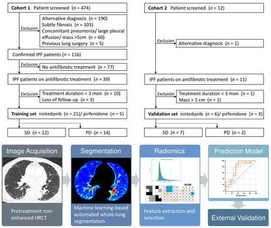 Training set—Of the initially screened 474 patients in cohort 1, 358 patients were excluded owing to the following reasons: alternative diagnosis (n = 190), presence of subtle fibrosis (n = 103), prespecified concomitant diseases (n = 60), and prior lung surgery (n = 5). The diagnosis of IPF was confirmed in 116 patients; among them, only 26 patients underwent antifibrotic treatment for at least three months and were finally included in the training set (SD/PD: 12/14).