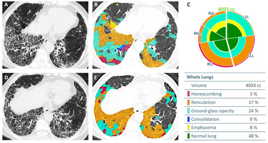 Automated quantification of CT parenchymal patterns in a 74-year-old male patient with IPF. Axial thin-section HRCT images obtained at the lung base, without (A,D) and with (B,E) overlay of color maps depicting the distribution and extent of different parenchymal abnormalities. The glyph and chart (C) summarize the percentage of the six parenchymal patterns.