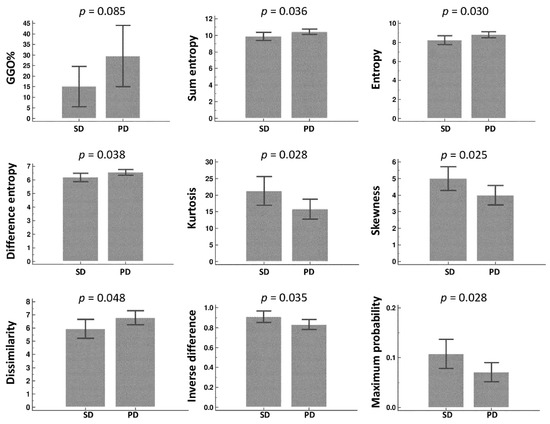 Comparison of the selected radiomic features and GGO% in the SD and PD groups.
