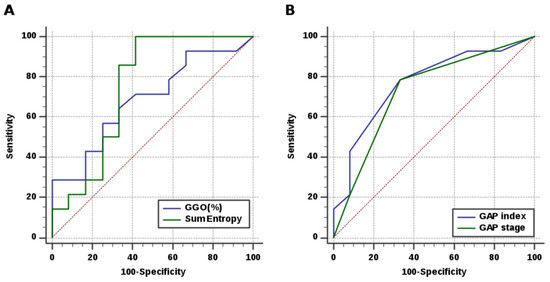 ROC curves of the prediction models for progressive disease. (A) The radiomic feature (sum entropy) demonstrated an acceptable AUC of 0.75 which was higher than that of the quantified parenchymal pattern (GGO%; AUC, 0.69), but was not superior to that of (B) the GAP index and stage (AUC, 0.77 and 0.73, respectively). The combined sum entropy-GGO% model improved the predictive performance with an AUC of 0.77.