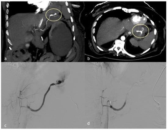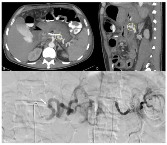 (a–d). A 60-year-old man with a walled off necrosis after necrotizing pancreatitis. (a,b) Axial and sagittal MPR reconstruction images demonstrate splenic artery PSA (circle) in direct connection with a walled-off necrosis, previously treated surgically. (c) Angiographic images of splenic artery PSA (arrow in (c)). (d) Final angiographic control after coil embolization demonstrates splenic artery recanalization distal to coil embolization by magna pancreatic artery.
