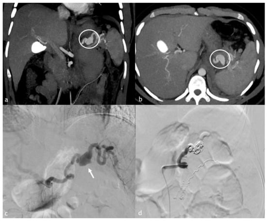 - Sawicki, M.; Marlicz, W.; Czapla, N.; Łokaj, M.; Skoczylas, M.; Donotek, M.; Kołaczyk, K. Massive Upper Gastrointestinal Bleeding from a Splenic Artery Pseudoaneurysm Caused by a Penetrating Gastric Ulcer: Case Report and Review of Literature. Pol. J. Radiol. 2015, 80, 384–387. [Google Scholar] [CrossRef] [PubMed]