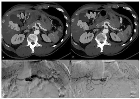 - Hyare, H.; Desigan, S.; Nicholl, H.; Guiney, M.J.; Brookes, J.A.; Lees, W.R. Multi-section CT angiography compared with digital subtraction angiography in diagnosing major arterial hemorrhage in inflammatory pancreatic disease. Eur. J. Radiol. 2006, 59, 295–300. [Google Scholar] [CrossRef]