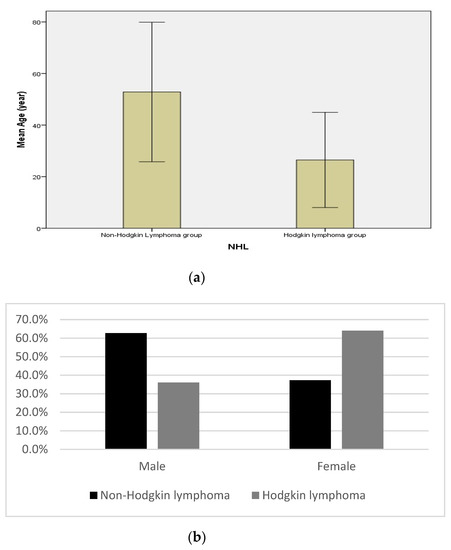 In describing the relationship between the type of lymphoma and demographic data (age and gender) of the studied patients, we observed a significant difference in age between the two types of lymphoma (patients with NHL were older than patients with HL, 53.82 ± 13.53 vs. 26.48 ± 9.23, respectively, at p = 0.001, Figure 2a). Furthermore, there was a significant difference in gender between the NHL and HL groups at p = 0.02. Males represented 62.7% of NHL patients versus 36% within the HL group (Figure 2b).
