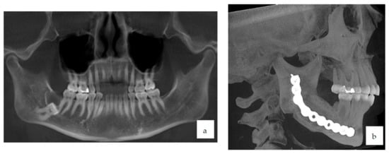 (a) Preoperative panoramic radiography; (b) cone beam computed tomography 3 years after surgery.