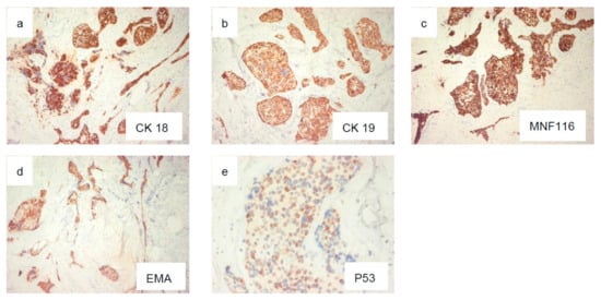 Positivity for AC anti-CK18 ((a), ×4), CK19 ((b), ×10), MNF116 ((c), ×10), EMA ((d), ×4), and P53 ((e), ×40).