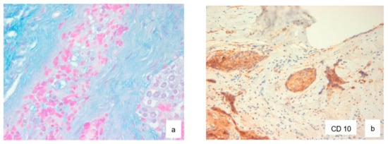 Alcian Blue staining ((a), ×40) and CD 10 immunohistochemistry ((b), ×10).