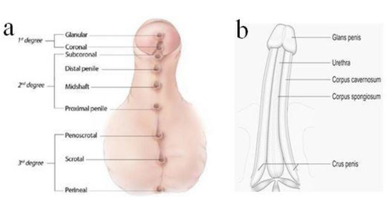Hypospadias is classified by severity, depending on the location of the meatus: first-degree hypospadias includes the more distal forms, glanular and coronal; second-degree hypospadias includes subcoronal and penile shaft hypospadias; and third degree—the most severe—includes scrotal and perineal hypospadias (Figure 1a) [1,2].