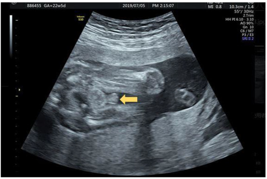 32 year old G3P1A1 GA 22 + 5 weeks with “blunt” instead of taper “pointed” penis tip (arrow).