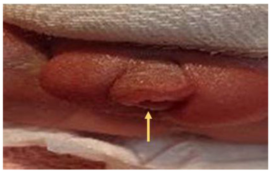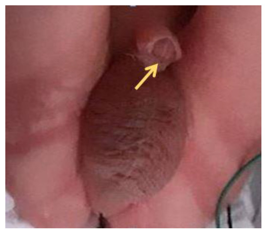 A male baby was delivered through cesarean section weighing 2624 g, and third degree hypospadias was confirmed postnatal (Figure 12).