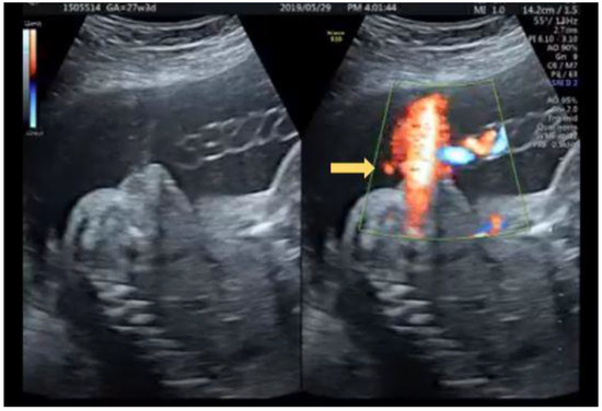 A 26-year-old female G1P0 pregnant at 27 + 3 gestational age was noted to have “tulip” signs over external genitalia resemblance a third degree hypospadias (Figure 10). Sagittal view after external provocation with jet of fanning urinary stream originated directly from perineum was noted (Figure 11). Coarctation of aorta and pulmonary stenosis was also noted in this fetus. Normal karyotyping with 46XY was found.