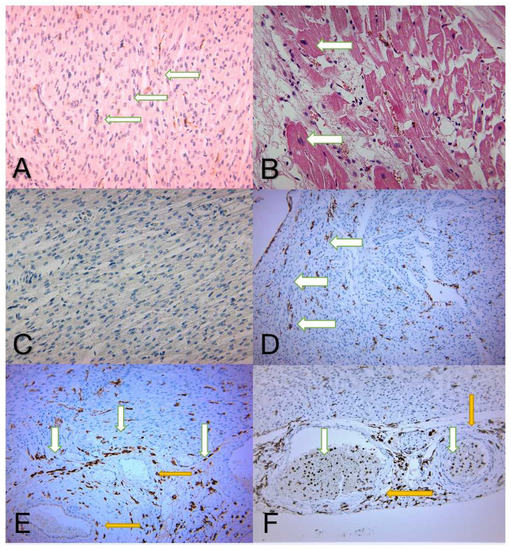 (A,B) H&E normal aspects of the control group, showing cardiac muscle fibers with interstitial edema and inflammatory infiltrate. (A) Cardiac muscle fibers with small nuclei located centrally—white arrows (magnification 100×). (B) The nuclei of the fibers are enlarged in volume, revealing cellular suffering—white arrows (magnification 200×). (C) The negative expression of CD14 in a specimen belonging to the control group. The causes of death in the control group were not related to heart disease (magnification 100×). (D) Immunohistochemical image of numerous myocardial fibers with inflammatory cells intercalated, with the membrane marked in brown, showing low CD14 expression (<10%)—white arrows (magnification 40×). (E) Immunohistochemical image of the myocardial cells, with numerous inflammatory cells intercalated and membranous immune expression of CD14 marked in brown and white arrows. Its expression is revealed mainly on the macrophage membrane surface, but also minimally distributed on the neutrophil surface of mCD14. No expression is seen in the blood vessels—yellow arrows (magnification 40×). (F) Immunohistochemical image of a blood vessel located intramuscularly—yellow arrows. In the vessel’s lumen there can be noticed granular areas of extracellular, soluble CD14 (brown color) along with monocytes and neutrophils (mCD14)—white arrows (magnifications 40×).