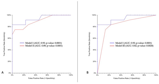 Non-inferiority test for two AUCs. Model I (symptoms, multivessel diseases, ischemia, and strain anomalies); Model II (ischemia and strain anomalies); Model III (symptoms and multivessel diseases). Panel (A) shows comparison between Model I (blue line) and II (red line) AUCs. In panel (B), comparison between Model I (blue line) and Model III (red line) AUCs. AUC: area under curve.