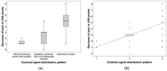 (a) Difference of VAS decrease comparing the three groups of contrast agent distribution pattern. Graphically summarizes the difference of VAS decrease comparing the three groups of contrast agent distribution pattern employing conventional boxplots. (b) Demonstrates the association between contrast agent distribution and effect on VAS. Graphically summarizes the difference of VAS decrease comparing the three groups of contrast agent distribution pattern employing conventional boxplots.