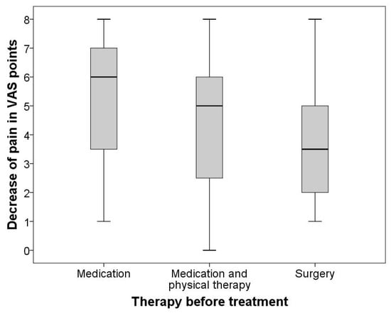 Kruskal–Wallis was used for group comparisons, and Spearman’s Rho was performed for correlative analysis. Kruskal–Wallis test revealed a statistically significant difference (p = 0.001) in clinical success reflected by VAS decrease when comparing the three distinct first-line therapies as a distinguishing variable. Figure 3 graphically summarizes the difference in treatment efficacy between the three first-line therapy groups employing conventional boxplots. Correspondingly, Spearman’s Rho showed comparatively strong associations between technical success (contrast agent distribution) and therapeutic effect (VAS decrease) in the pharmaceutical-only group (r = 0.587, p = 0.001), pharmaceutical + physical therapy group (r = 0.564, p < 0.001) but only a relatively weak association (r = 0.384, p = 0.006) in the surgery-first group.