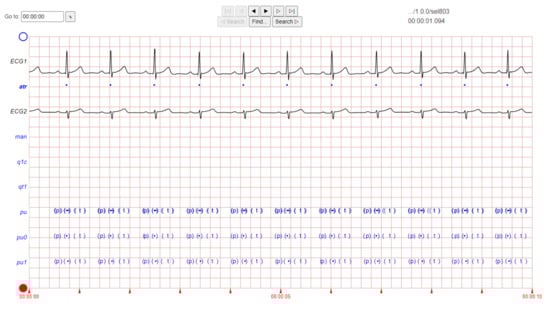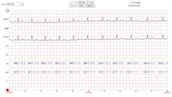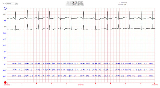 The ECG images that were used as data input for the CNN were obtained from an open-source database, namely, the QT Database from the PhysioNet [28]. An example of ECG images, i.e., ‘normal’, ‘sudden death’, ‘arrhythmia’, and ‘supraventricular arrhythmia’, waveform is presented in Figure 1, Figure 2, Figure 3 and Figure 4. These data were preprocessed prior to building a CNN model for ECG classification and prediction. Four classifications have been selected from several patients, with multiple images taken from each patient. Images were manually cropped from one recording signal that consist of one complete pulse (P wave, QRS complex, and T wave), with the exceptions of cardiac abnormality categories, where certain visual features may be absent. The objective of the cropping is to simulate the camera capture during the development of the online and real-time ECG signal classification and prediction presented in Section 5.