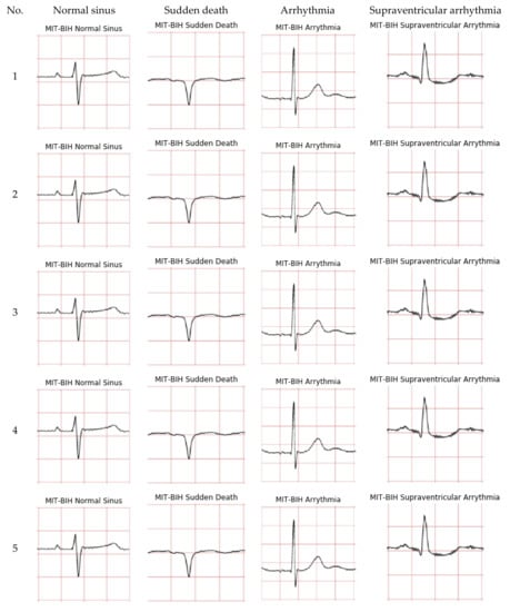 An example of data/image preprocessed with a uniform length and width is presented in Figure 5. Figure 5 includes the preprocessed images for ‘normal sinus’, ‘sudden death’, ‘arrhythmia’, and ‘supraventricular arrhythmia’ ECG waveform which are originally presented in Figure 1, Figure 2, Figure 3 and Figure 4, respectively.