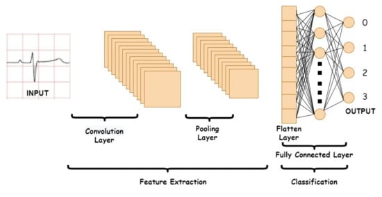 A convolutional neural network (CNN) is a type of deep learning algorithm that consists of various functions such as local perceptions of images, sharing weights, filters, subsampling, fully connection, and multi-classification. In the classification and prediction of multi-classes of ECG waveforms, the first step of CNN is to generate local perceptions of images. CNN is a deep learning method that is often used in hardware implementations for image classification [27].