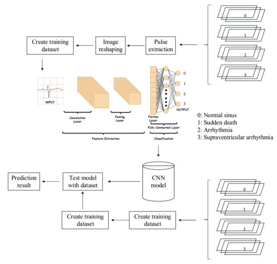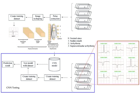 There are two main processes in building a deep learning model: the training process and the testing process. The dataset used will be divided into two for training purposes and testing purposes. The dataset used for training must be more than the testing dataset. The dataset which is divided into four classes—normal, sudden death, arrhythmia, and supraventricular arrhythmia—will be processed using pulse extraction which will extract the image dataset into binary codes so that it can be processed in the computational process. Then, the dataset will be manipulated to optimize the training process with image reshaping. After that, the ready dataset will go into the cache memory for the implementation of the CNN algorithm. The testing process is the same as the training process. The processed testing dataset is used to evaluate machine learning models. If the model performance is optimal, then the model can be implemented on hardware.
