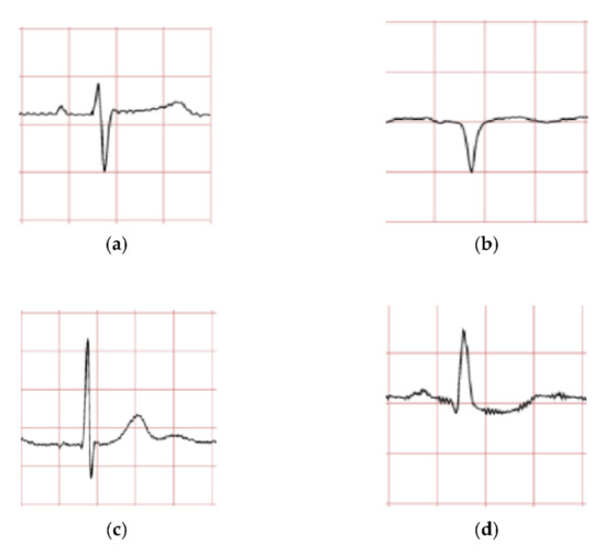ECG data preprocessed: (a) normal sinus ECG waveform; (b) sudden death ECG waveform; (c) arrhythmia ECG waveform; (d) supraventricular arrhythmia ECG waveform.